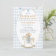 Invitar a sus seres queridos a celebrar a su bebé con esta adorable invitación a la ducha de bebé "Podemos esperar temprano". Con un oso de peluche dulce sobre un balancín de caballos y suaves tonos azules, es perfecto para una ducha de bebé acogedora y elegante.