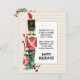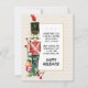 Diseño de acuarela con un soldado de juguete nostálgico que lleva un uniforme rojo y un sombrero negro alto con una pluma roja que se encuentra entre algunas bolas de adorno de Navidad a rayas y vegetación navideña con bayas rojas. El poema original en la parte delantera es editable - ¡hazlo tuyo! El texto dice "Los juguetes de Navidad y los juegos animados son formas encantadoras de jugar, pero sé que mi mayor alegría eres tú en este día de Navidad. ¡Felices Fiestas!". La parte trasera de la tarjeta tiene los adornos y la vegetación en las esquinas y tiene espacio para que escribas tu mensaje personalizado y firmes tu nombre.