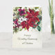 Tarjeta de aniversario de boda en día de Navidad con poinsettias, ramitas de pino, acebo y confeti dorado en la parte superior
