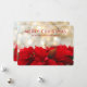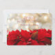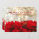 Una tarjeta de felicitación plana de Feliz Navidad con una fotografía festiva con un ramo de poinsettias rojas en el fondo. Luces de bokeh doradas brillantes en el fondo. Elegante y sofisticado. Tipografía navideña escrita con un moderno tipo de letra roja.