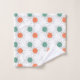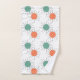 Este conjunto de toallas tiene un diseño moderno de mediados de siglo, con círculos con líneas en naranja y verde.