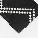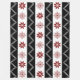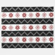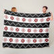 Una manta que ofrece un modelo de copos de nieve y de rayas negras rojos sobre un fondo blanco.