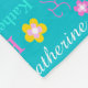 Nombre tipográfico y flor acuática, rosa, amarillo y blanco sobre un diseño de manta personalizado de fondo de agua oscura. El color de fondo se puede cambiar si es necesario. Divertido texto gráfico personalizado y arte floral manta personalizada. Ideal para el coche, acampando para las noches de invierno o excursiones. Personaliza con tu propio nombre, actualmente lee Katherine para obtener ayuda con la personalización y otras longitudes de nombres por favor contáctame. © Arte y diseño de Sarah Trett para www.mylittleeden.com