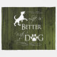El establecimiento ofrece un ambiente acogedor en las noches de otoño y una vida mejor con una manta de lunas de perro. El diseño de una manta incluye un texto que dice "La vida es mejor con un perro", con una huella de pata y un adorno de silueta de perro contra un fondo rústico de madera de color verde profundo. También hay artículos de regalo adicionales disponibles con este diseño.