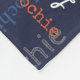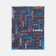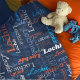 Texto tipográfico de nombre corto azul medio, gris, azul cian, naranja y blanco sobre un diseño de manta personalizado de fondo azul oscuro. El color de fondo se puede cambiar si es necesario. Divertido texto gráfico personalizado manta personalizada. Ideal para el coche, acampando para las noches de invierno o excursiones. Personaliza tu propio nombre corto, actualmente lee Lochie para obtener ayuda con la personalización y otras longitudes de nombres por favor contáctame. © Arte y diseño de Sarah Trett para www.mylittleeden.com