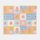 Diseño de manta de pastel adorable con un patrón de parche de nubes felices, corazones y estrellas en tonos suaves de amarillo, rosa, azul y crema. Perfecto para decoración hogareña acogedora, alegre y caprichosa.