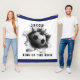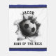 Manta de fútbol creativa con diseño de balón de fútbol volando. Para personalizar, edite el texto para agregar el nombre. Cambie el color de fondo azul al color del equipo con un simple clic.
