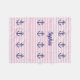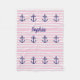 Una manta rosa rayada cubierta de anclas azules. Hecho de lana suave. Monograma con tu nombre. Agradable y cómodo.