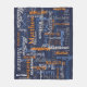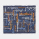 Texto tipográfico de nombre corto azul, naranja, gris y blanco sobre un diseño de manta personalizado de fondo azul oscuro. El color de fondo se puede cambiar si es necesario. Divertido texto gráfico personalizado manta personalizada. Ideal para el coche, acampando para las noches de invierno o excursiones. Personaliza tu propio nombre corto, actualmente lee Matthew para ayuda con personalización y otras longitudes de nombres por favor contáctame. © Arte y diseño de Sarah Trett para www.mylittleeden.com
