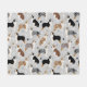 Pastores australianos cortos / Perros australianos con abrigos negros, marrones y merluzas sentados y parados con huesos de perro dispersos y huellas de pata en un fondo gris claro.