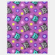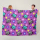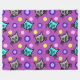 Una manta de mimbre de gran tamaño que presenta un diseño de patrones adorable y colorido de gatos grises y verde azulados contra un fondo violeta púrpura con acentos de puntos polka multicolores.