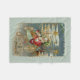 ¡Aquí viene Santa! Él está dirigiendo su asombrosa máquina voladora a través del cielo nocturno. Estrellas, rebozadores y decoraciones elegantes cubren el avión y su carga de maravillosos juguetes para Navidades por la mañana. La imagen restaurada de una postal victoriana presenta un fondo helado, acentos dorados y colores brillantes y bonitos. Está enmarcado en músculos y adornos con un pueblo de Navidades al fondo.