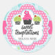© 2012 Diseños de Socialite. Nuestro divertido sello / pegatina de la caja de panadería rosa, blanca, turquesa y verde tiene tres quequitos, en un llamativo cartel de polika-punto, un fondo de polika-punto loco y cinta rosa. Todos los elementos de diseño se pueden mover, cambiar de tamaño o borrar para que se adapten a su negocio de panadería. Simplemente reemplace el texto de nuestra plantilla con la información de su empresa.
