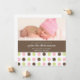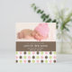 Este magnífico anuncio de nacimiento muestra una foto paisajística de tu nuevo agregado en la parte superior, una tira marrón con detalles de nacimiento del bebé debajo, y polkadots rosados, verde claro y marrón en la parte inferior.