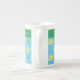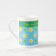 Una taza de bonito de China ósea para personalizar, con un patrón de Primoras y puntos de Polka Verde sobre un fondo azul cielo, en equipo con puntos de polka amarillo y blanco; parte de la colección de 'Primorroses' de Posh y Painterly.