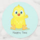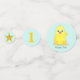 Pollito feliz con estrella en confeti de mesa de fiesta azul claro. Texto listo para ser personalizado. Ideal para baby shower, cumpleaños del primer año y más.