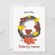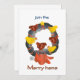 Invitación a la fiesta con diversión y humor. Gallinas decoran una corona con una estrella dorada y cinta roja.