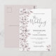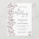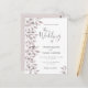 Una invitación de bodas a la moda en rosa polvoriento y blanco. Un fondo blanco de moda en la parte delantera. Decorada con polvorientos botánicos de color rosa y follaje. Guión moderno de gran tamaño con letra, tipografía con el texto: El boda de. Plantillas para nombres y detalles del boda. Texto gris. Parte posterior: fondo rosa polvoriento claro.