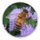 Este botón de puerta de cerámica animal ofrece un oro y una abeja negra de la miel que polinizan las flores violetas púrpuras pálidas de una planta del ageratum.