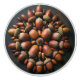 Se ha dispuesto de forma circular bellotas, con diferentes tamaños y tonos marrones. Las texturas y detalles de las bellotas se resaltan en un fondo oscuro.