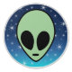 Una cabeza extraterrestre verde con grandes ojos ovalados negros y una pequeña hendidura negra para una boca. El fondo es de color degradado de color oscuro a azul claro, salpicado de estrellas blancas.
