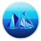 Pomo en una pintura digital geométrica de una velera / yate en tonos azules del océano, desde agua clara hasta cobalto profundo