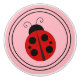 Una mariquita roja y negra grava un fondo rosado. Dos círculos negros rodean la mariquita