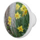 Este botón de cerámica ofrece narcisos de la primavera contra un árbol grande en Nueva Inglaterra. Copyright: Marjorie Tietjen