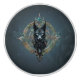 Los lobos negros se enarbolan con ojos azul penetrante, colocados sobre un fondo circular y ornamentado. El fondo es un diseño complejo de motivos dorados e iridiscentes, que se asemeja a un símbolo mágico. La piel del lobo se detalla con líneas y sombras intrincadas, dándole una presencia mística y poderosa.