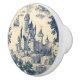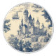 Patrón de tela de jouy en azul profundo mediterráneo sobre fondo crema. Un romántico castillo francés cerca del mar con velero y paisaje. Patrón de herramientas clásico.