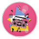 Diseño de boombox de estilo retro colorido con formas geométricas, triángulos, rectángulos y formas redondeadas a rayas