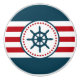 Diseño náutico con decoración de ruedas de vela en forma redondeada con estrellas sobre fondo rayado rojo, azul y blanco