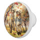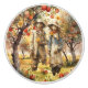 Dos espantapájaros se alinean entre manzanos en un huerto, rodeados de manzanas maduras en las ramas y esparcidas por el suelo. Están vestidos con ropa vieja y tienen gorras en la cabeza, parados en un ambiente tranquilo y soleado. Photoshop CS5 de arte digital