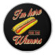 Diseño de texto de estilo retro colorido "Estoy aquí por los Wieners" con colorida y sabrosa decoración de hot dog