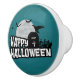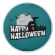 Feliz ilustracion de diseño de texto de Halloween con decoración de cementerios y murciélagos en luna llena sobre fondo azul grunge