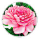 Pomo con una gran imagen de un aroma de peones, en tonos pastel o rosa de coral medio, con hojas de color verde esmeralda