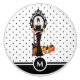 Diseñado por Farida Greenfield. Un ilustracion de moda de una dama con un hermoso y elegante vestido negro largo y elegante, con una escoba de brujas decorada con cintas negras con calabazas en el primer plano y un patrón de puntos de polka blanco y negro en el fondo. Tiene personalizable monograma inicial y nombre en la parte inferior. Diseño perfecto con tema de Halloween.