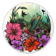Este vibrante diseño gráfico capta la esencia de la primavera en un exuberante jardín, donde un delicado colibrí coquetea elegantemente entre un tapiz de flores de colores. La escena está llena de vida, con una rica paleta de florecientes flores en tonos rosa, amarillo y morado, en contraste con los verdes profundos de los árboles florecientes que se desprenden suavemente de la cálida brisa. La luz del sol se filtra a través de las hojas, proyectando un resplandor dorado sobre todo el paisaje, destacando las plumas irridiscentes del colibrí mientras se mantiene parado, listo para sorber el néctar de una flor cercana. Este retrato encantador invita a los espectadores a sumergirse en la belleza de la naturaleza, evocando sentimientos de alegría, tranquilidad y la maravilla del exterior.