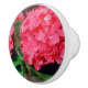 La fotografía original de MaeFlowers en este pomo de cerámica es un cierre de hortensias rosadas y sus hojas verdes de primavera con un borde de jaula. La pompa central de pétalos de flores casi llena la foto, rodeada por las hojas verdes y trozos de otras pompas de flores a cada lado.