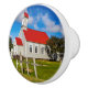 Tradicional iglesia islandesa con tejado rojo y rodeada de césped, algunos árboles y algunas cruces.