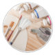 Tejidos cerámicos con una imagen de diferentes materiales artísticos, incluidos cepillos, escamillas, anguilas y algunos tubos de pintura al óleo.