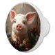 Postal con pintura al óleo digital de un lindo cerdo rodeado de conos de pino y guirnaldas de pinos con luces de Navidad. El fondo de madera aporta un toque rústico a las obras de arte.