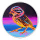 Un llamativo ilustracion de neón de un gorrión adornado con anillos brillantes y acentos vibrantes, ambientado en un audaz fondo inspirado en la onda sintética de púrpura, azul y rosa. Esta obra de arte retro-futurista de aves es perfecta para los aficionados a la estética de vaporwave, el arte digital brillante y los retratos surrealistas de animales.