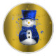 Un bonito y colorido patrón de Navidades con hombres de nieve vestidos con sombrero de terciopelo azul y chalecos, sobre un fondo dorado festivo con estrellas doradas para añadir un toque elegante y caprichoso a la decoración de casa de tus Navidades este año.
