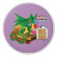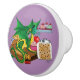 Un pequeño dragón verde se sienta sobre una tabla de corte de madera en el mostrador de la cocina. Los productos horneados como galletas, muffins y quequitos están alrededor del dragón verde de la cocina en un fondo morado.