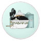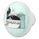Un gato blanco y negro esponjoso sentado en un tazón en un mostrador de cocina negociando con sus seres humanos. Quieren comida a cambio del arco en el que están.