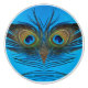 Cara de pájaro creada a partir de imágenes de plumas de pavo real reflejadas en un fondo metálico azul.