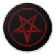 Rojo, pentagrama invertido y texturizado en círculo, sobre fondo negro. Símbolo oculto. 666