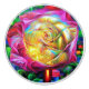 Una fascinante pintura digital de un rosa reventando con energía psicodélica y tonos arcoiris. Los pétalos rosados vivos se envuelven alrededor de un núcleo dorado brillante, creando una pieza central floral surrealista.