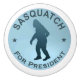 Una silueta oscura de Sasquatch (Pie Grande) sobre un fondo azul medio junto con un texto en bloque que dice "SASQUATCH FOR PRESIDENT". ¿No está exactamente emocionado con la elección de candidatos para presidente esta vez? ¿Buscando un forastero de Washington? Aquí está tu candidato. De hecho, Bigfoot gasta casi todo su tiempo fuera en Washington, Idaho, Oregon, varios otros estados y partes de Canadá. Lo suficientemente grande como para ocupar cualquier lugar, pero no hay necesidad de preocuparse de que arengará al Congreso para imponer una agenda radical, de izquierda o derecha, como muy pocas veces se lo ve. Traído por el Comité de Acción Política de Criptozoología (CPAC); Bonners Ferry, ID